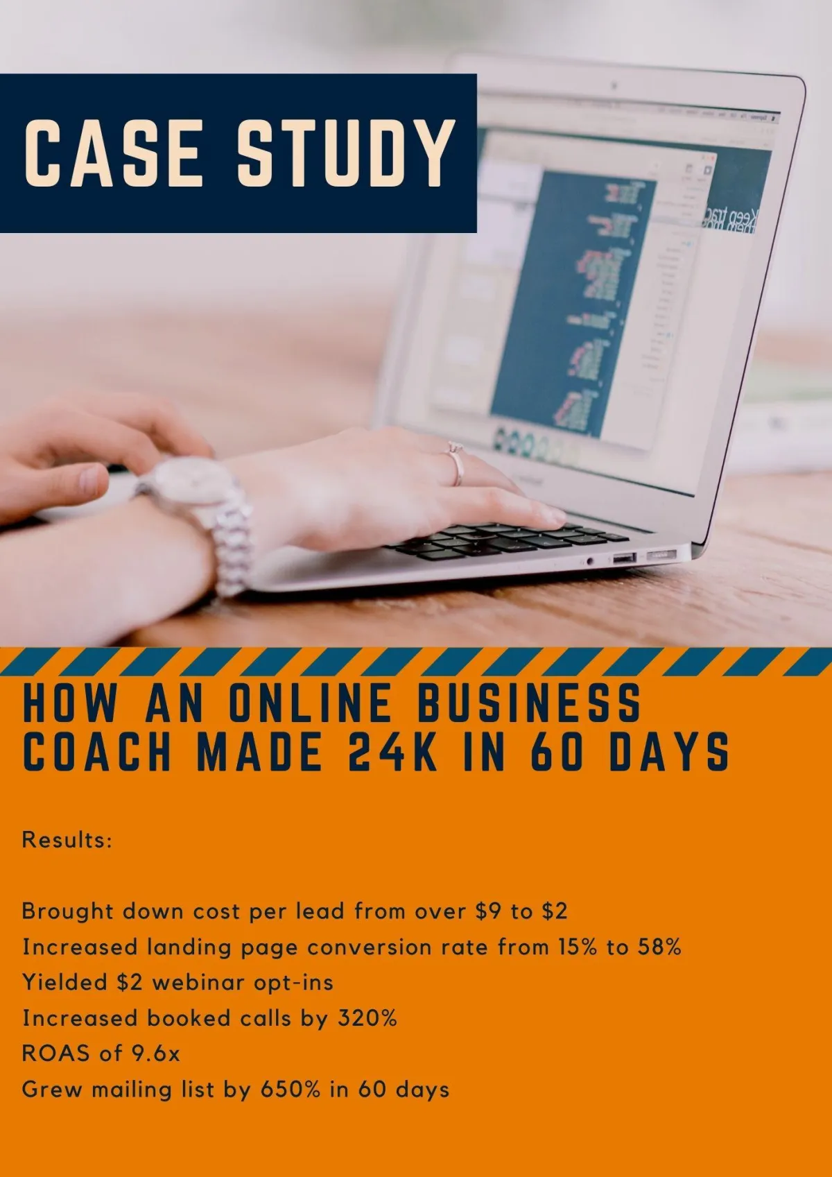 The coach experienced a 650% increase in freebie traffic, a ROAS of 9.6x, webinar registrations for $1.99, increased booked calls by 320% and increased landing page conversion rates to 58%.