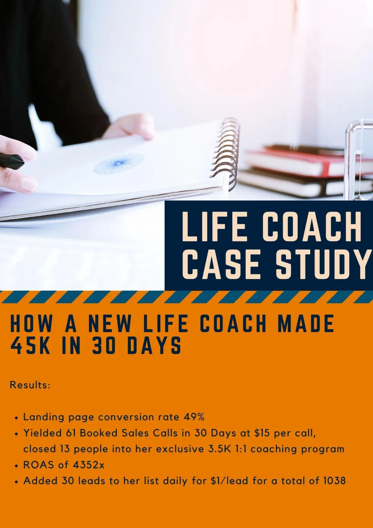 The coach experienced a 49% landing page conversion rate, booked 61 sales calls in 30 days at $15 a call and closed 13 people into her high-ticket coaching program.